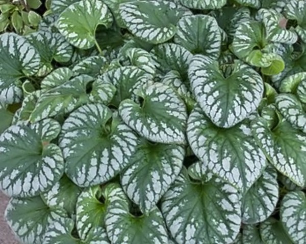 Бруннера крупнолистная Эмеральд Мист - листья с крупными серебристыми пятнами по краю или почти по всей листовой пластинке.