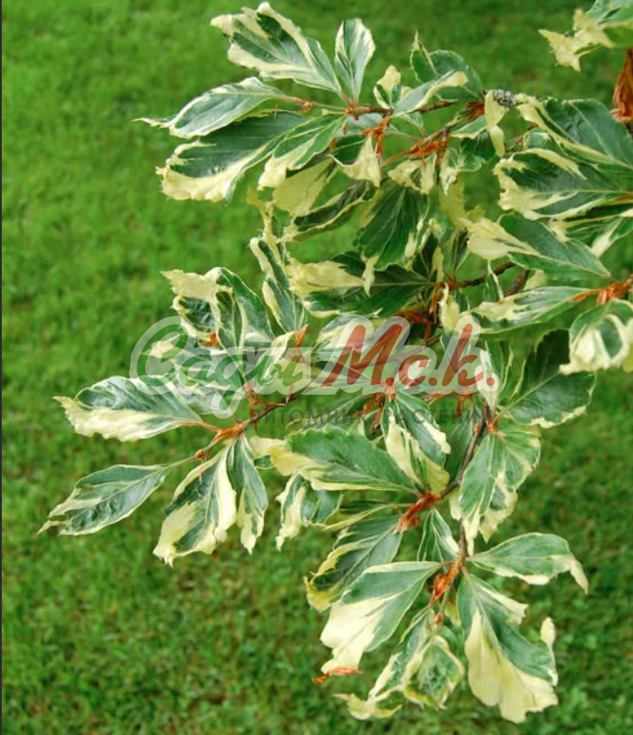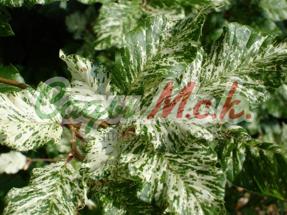 Бук лесной Франкен на штамбе – молодые листья с многочисленными белыми крапиночками, почти белые
