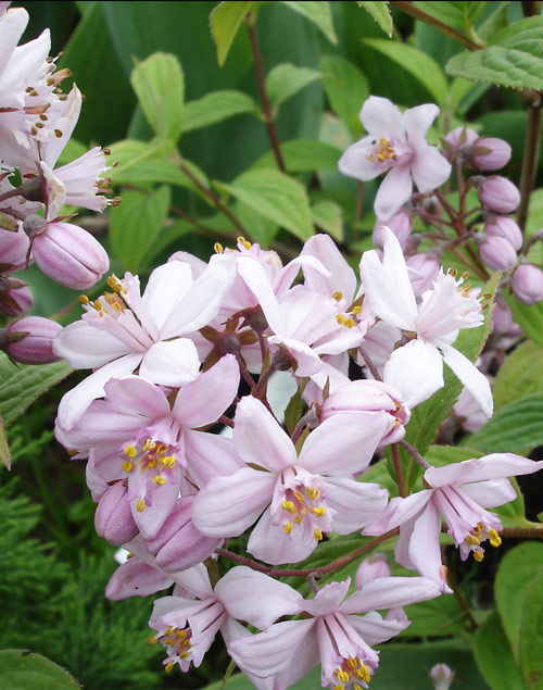 Дейция изящная Пёрл Роуз растет до 1,5 м в высоту, что дает возможность создавать на участке зеленую изгородь, украшать территорию возле беседок и т.д. Имеет красивые темно-зеленые, шершавые, ланцетные листочки.Цветочки очень красивые, имеют звездчатую форму и белые с темно-розовыми кончиками лепестки. Крупномер Pearl Rose растет в любой плодородной умеренно-влажной почве, лучше растет на солнечной стороне, но легкое затенение от полуденной жары тоже должно быть. В сильные морозы может замерзнуть до уровня снега, но в новом сезоне появятся новые побеги.