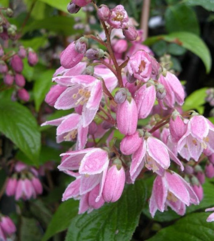 Дейция Tourbillon rouge - декоративный кустарник с вертикальными, гибкими стеблями. Он малого и среднего размера, покоряет своими захватывающими цветками весной. Вырастает до 150 - 200 см в высоту и до 120 см в ширину. Листья светло-зеленого цвета, узкие, овальные, грубые. Они достигают в длину от 6 до 10 см. Цветки относительно крупные, звездообразные, собраны в рыхлые соцветия. Лепестки розовые, затененные, с узким белым краем с внутренней стороны и светлым центром. Цветки слегка ароматные. Данное растение цветет обильно. Темпы роста средние.
