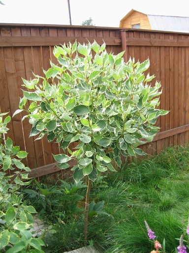 Кустарник привитый на штамб 120-140 см, ширина кроны может достигать в диаметре 150-200см., с тонкими, гибкими, кораллово-красными или красно-бурыми, направленными вверх ветвями. Листья яйцевидные, длиной 4-8 см, заостренные, серо-зеленого цвета с неравномерной кремово-белой каймой, осенью фиолетово-красные. Похож на сорт дерена белого Sibirica Variegata, но куст более крупный. Цветет в июне, в течение 15-20 дней, желто-белыми мелкими цветками, собранными в плотные полушаровидных соцветиях, диаметром до 5см. Растет быстро, до 50 см в год. Зимой декоративно смотрятся красные побеги на фоне белого снега. Быстро отрастает, переносит обрезку, идеально подходит для живых изгородей. Хорошо переносит морозные зимы