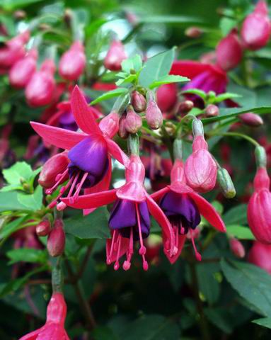 Маленький компактный и очень густой куст фуксии во время цветения полностью покрыт гроздьями некрупных ярких цветов. Фуксия может иметь юбочку контрастных тонов по сравнению с красными лепестками. Растению требуется солнце, только тогда фуксия порадует удивительно буйным цветением. Фуксия не выносит зимовки в открытом грунте, поэтому осенью необходимо внести его в тепло.