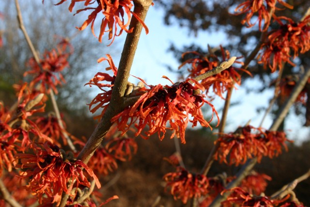 Гамамелис (волшебный орех) Diane - небольшое листопадное деревце или кустарник (общим обликом напоминает лещину) с бурыми, звездчато-опушенными побегами. Темно-зелеными кожистыми листьями и ярко-желтыми или красными, четырехмерными, обоеполыми цветками. Четыре узких лентовидных лепестка, распростерты в разные стороны, так что в диаметре цветок достигает нескольких сантиметров. Цветение длится не менее двух-трех недель, а при благоприятной погоде и дольше. Замечательна и продолжительность цветения. Крона гамамелиса — ажурная, широкая, округлая. Листья крупные, 8-15 см длиной и 5-6 см шириной, плотные.