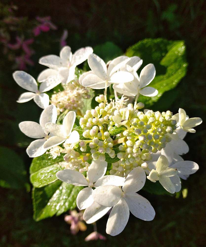 Пока название 'Star Rose' будет универсальным для отечественного рынка. Впоследствии сорт будет зарегистрирован во Франции под другим именем. Куст высотой 2 м, имеет прочные, жесткие побеги темного красно-коричневого цвета. Соцветие округло-конической формы, состоит из фертильных и стерильных цветков. Огромные, до 8–10 см в диаметре, стерильные цветки состоят из четырех узких, длинных, широко расставленных друг от друга лепестков. Эти «пропеллеры» создают эффект порхающих бабочек. Они белые, но к концу сезона розовеют, причем неравномерно, и получается красивое сочетание белого и нежно-розового. Длина соцветия 10–15 см. Период цветения: июль–сентябрь
