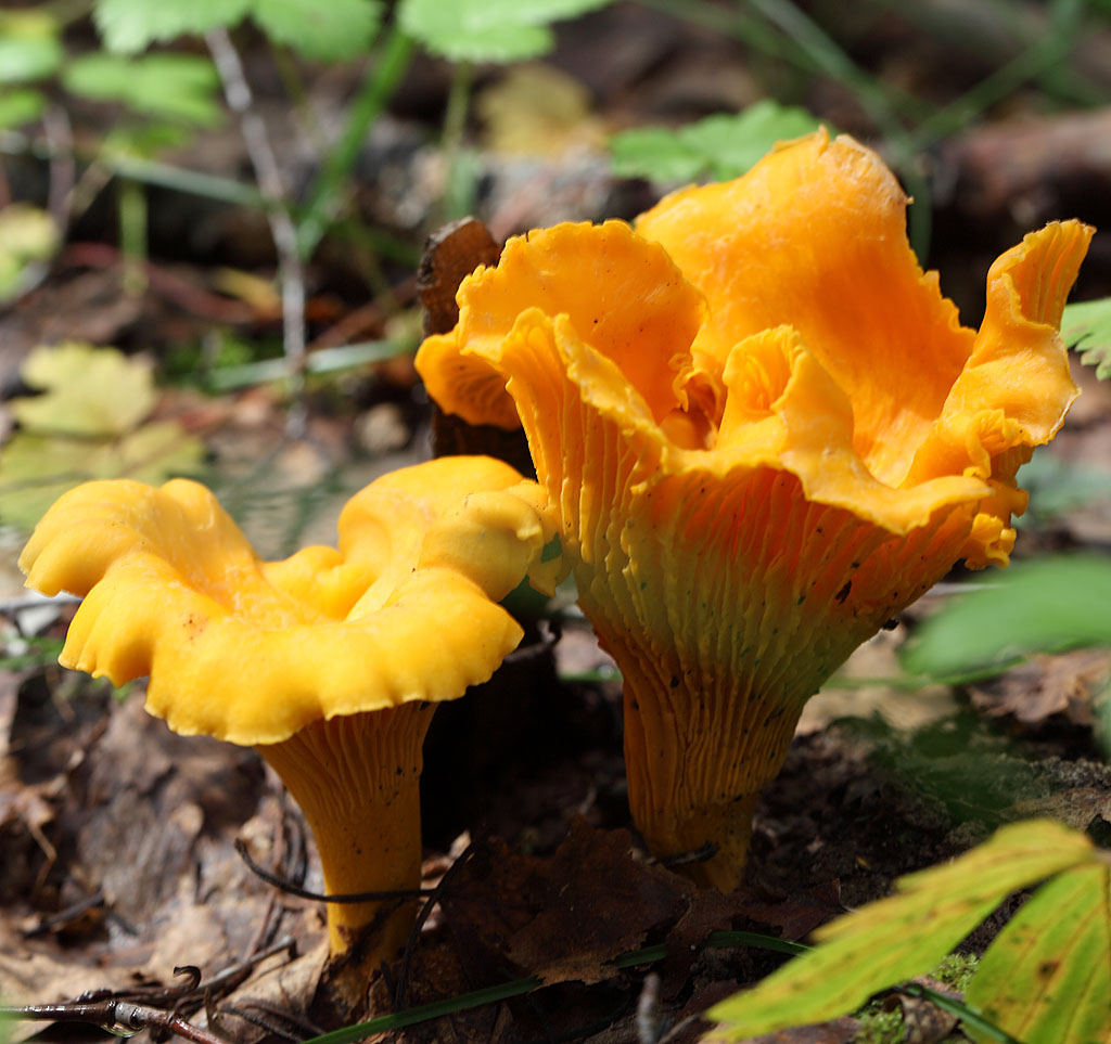 Гриб Лисичка настоящая - шляпка лисички (Cantharellus cibarius) (диаметр 3-14 см) желтая или оранжевая, неправильной формы. Может быть как вогнутой, так и выпуклой, воронковидной или распростертой. Ножка (высота 3-10 см) сплошная и толстая, обычно срастается со шляпкой и имеет сходный с ней цвет. Расширяется снизу вверх. Мякоть белая, плотная и очень мясистая, может быть и волокнистой. Немного краснеет при надавливании. Вкус у свежесрезанного гриба слегка кисловатый, а аромат напоминает запах сушеных фруктов.