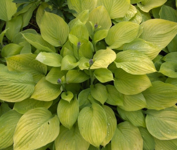 Хоста Zound's - быстрорастущее растение до 50 см. Листья морщинистые, округлые, с восковым налетом; растение выглядит как бы бронзовым. Цветки с сиреневым оттенком.