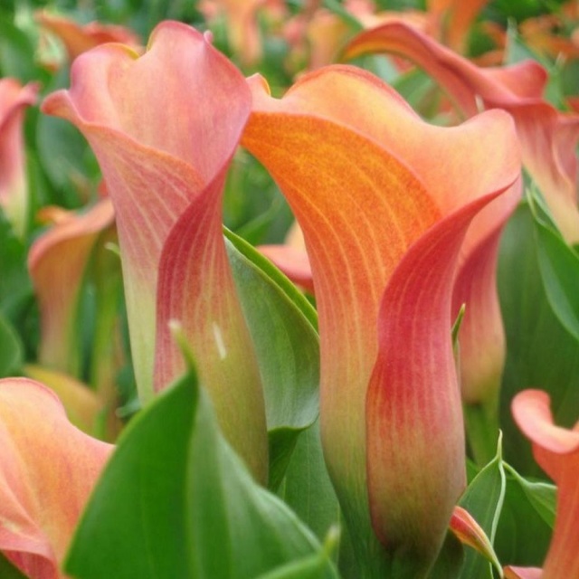 Калла Мерседес - очень яркая, практически светящаяся калла. Цветки сочного мандариново-оранжевого цвета с золотисто-желтыми основаниями. Подходит для выращивания в контейнере. В соцветии каллы формируется сразу несколько цветоносов. Высота цветущего растения до 45-50 см. Аромат у растения проявляется в теплую погоду, в нем присутствуют ярко выраженные нотки ванили. Цветет калла с июля по август.