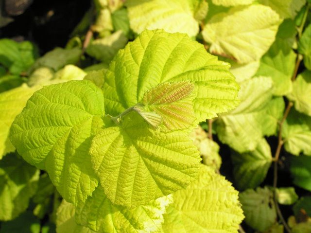 Лещина Aurea - это крупный кустарник высотой и шириной до 6 м. Крона широкая с многочисленными вертикальными стволами. С годами крона становится зонтиковидной формы. Растет медленно в молодом возрасте, позже быстрее. Цветы – изящные желтые повисающие сережки. Плоды – округлые или продолговатые орехи. Листья при распускании золотисто-желтые, летом лимонно-зеленые, осенью становятся желтыми, крупные до 12 см длиной.