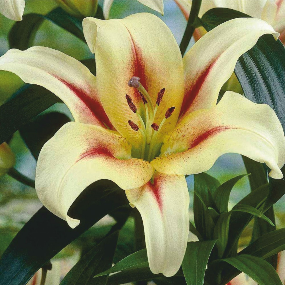 Луковицы Лилии ОТ-гибрид Нимфа (Lilium OT-hybrid Nymph) понравятся любителям ярких многоцветных и броских растений. Необычность очень крупного цветка, до 22 см в диаметре, заключается в окраске лепестков. У самого основания они зеленоватые, в середине широкие ярко-малиновые мазки переходящие в кремовый цвет кончиков и краев. Пыльники крупные, темно-коричневые. Период цветения июль-август, в это время сад наполняется сильным пряным ароматом даже при небольших групповых посадках. Цветы Лилии ОТ-гибрида Нимфа отлично смотрятся в ступенчатых композициях. Одна веточка может заменить полноценный букет в вазе.