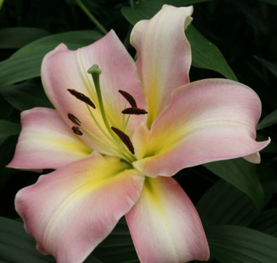 Лилия Urandi поражает воображение своей необыкновенной расцветкой, в которой гармонично сочетаются нежно-розовый, светло-оранжевый и желтый цвет. Внутренняя сторона розовая с бледно-желто-зеленым у центральной жилки, центральная жилка в основании ярко-желтая, внешняя сторона розовая с желто-зеленым оттенком. Лепестки со слегка волнистыми краями и сильно загнутыми кончиками. Диаметр цветка 25 см. Высота 100-110 см, со временем около 2 м. Аромат нежный и приятный. Цветение начинается с конца июня - начала июля.