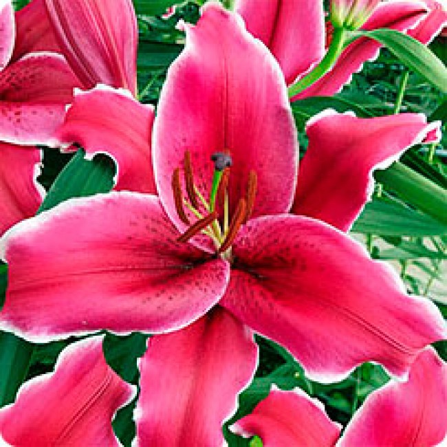 Луковицы лилии восточной Зорро (Lilium hybrid oriental Zorro) используются для получения высококачественной срезки и украшения сада привлекательными и очень ароматными цветами. Расти многолетник предпочитает на солнечных участках. К почве растение не требовательно. Но лучшим выбором будут дренированные, питательные, песчано-глинистые или известковые грунты. Зацветают лилии восточные Зорро в июле – августе. Бутоны очень крупные, диаметром до 22-25 см. Лепестки широкие, окрашены в малиново-красный оттенок и украшены белоснежной окантовкой. Края у Лилии восточной Зорро полностью волнистые. На одном стебле (высота до 120 см) одновременно формируется 12-14 бутонов.