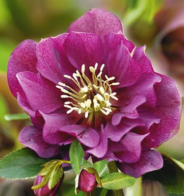 Морозник восточный Дабл Элен Ред (Double Elen Red) - многолетнее декоративное растение сплотной фактурной листвой и красивыми цветками. Цветок махровый (более 15 лепестков в одном цветке), крупный, винно-красный с разводами по лепестку. Тычинки пушистые, кремовые. Этот сорт цветет продолжительно с апреля по июль. Высота куста варьируется от 30 до 50 см.