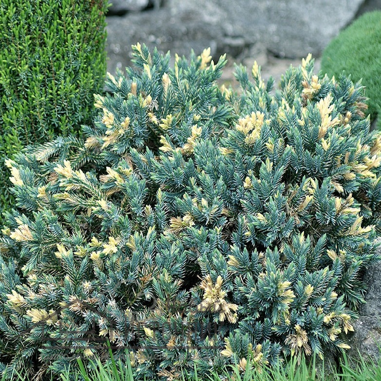 Можжевельник Golden Flame - декоративность этому можжевельнику придают контрастные кремовые пятная хвои на верхушках побегов, которые по всей длине покрыты сине-зелеными иголками. Считается крупным сортом, вырастает до 2-3 м в диаметре кроны, но такие результаты можно увидеть только через несколько лет при хороших условиях. Морозостоек.Оптимальные условия почвы – умеренное увлажнение и хороший дренаж.