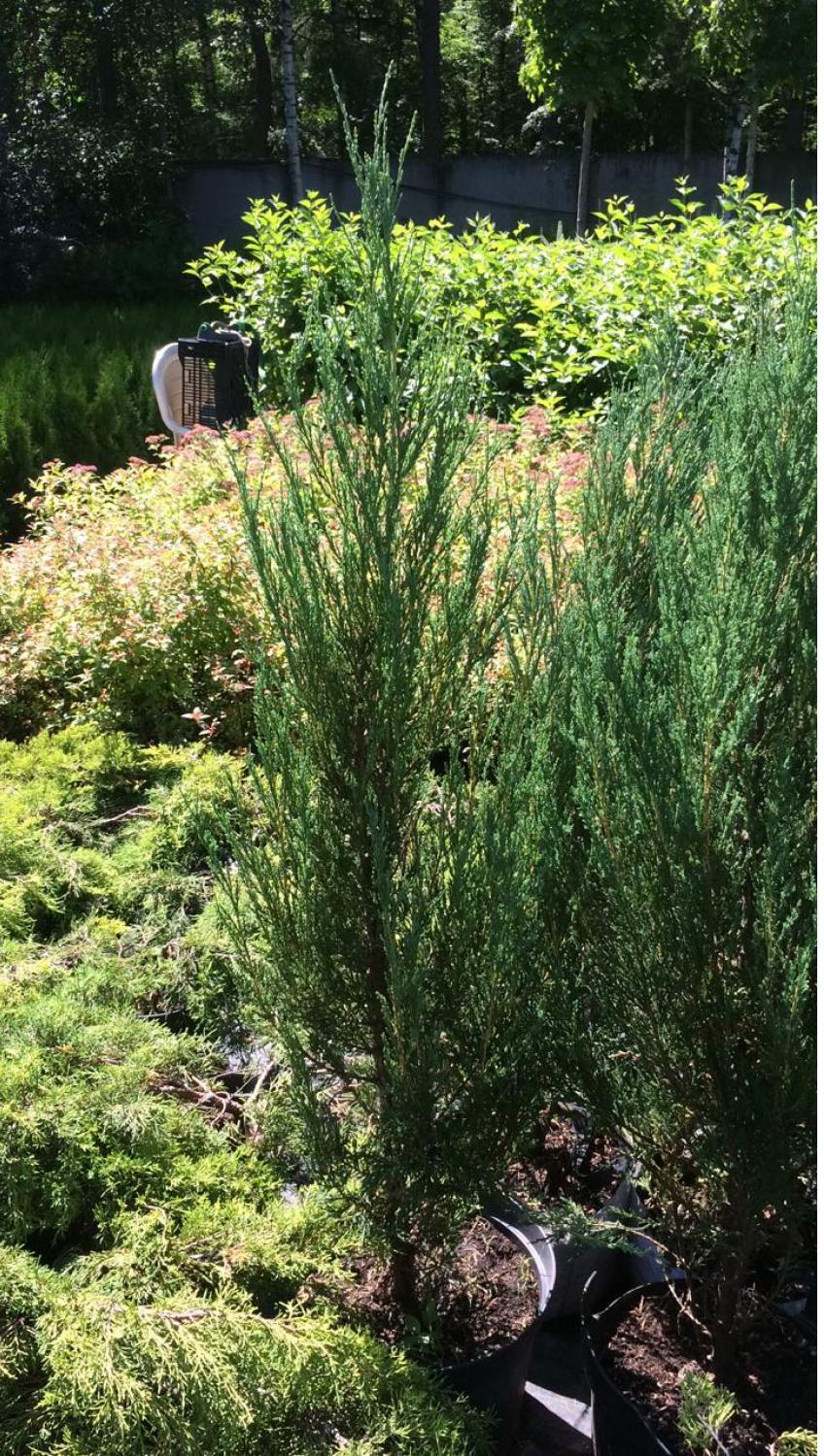 Саженцы можжевельника скального Blue Arrow , напоминающего аккуратное деревце, предлагает наш интернет-магазин. 10-летний кустарник вырастает до 2,5 м в высоту, формируя узкую крону в форме колонны шириной около 0,5 м. Ветки плотно прижаты друг к другу, вертикальные. Нижние побеги идут прямо от основания и долго сохраняют декоративный вид. Крупномер скальный Blue Arrow покрыт мягкой, чешуйчатой хвоей насыщенного голубого окраса. Можжевельник отлично приживается на любой почве, засухоустойчив, терпеливо выносит сухой воздух.