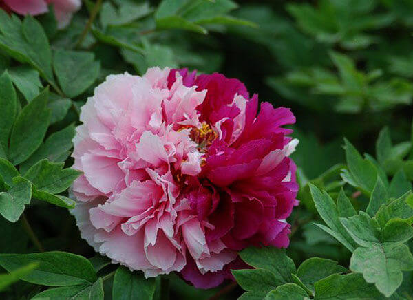 Окрас древовидный пиона Hua Er Qiao часто двухцветный пурпурно-красный с розовым либо белый с темно-фиолетовым вкраплением. Причем на одном кусте могут встречаться цветки разного окраса. Сами лепестки плотные, стебли длинные, жесткие, цветки – вертикально расположенные, в форме розы. Взрослое растение может приносить до 100 цветков. Сорт великолепно подходит и для ландшафтного озеленения, и для среза. Рост энергичный. Кусты выносливы и устойчивы к болезням. Цветение в середине сезона. Цветы 16?6 см. Высота куста до 1,5 м.