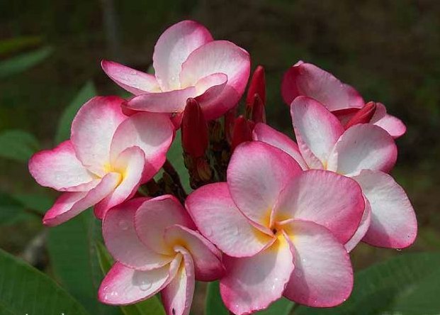 Plumeria Kasem Delight - небольшое тропическое деревце, цветет соцветиями крупных 5-лепестковых цветков. Лепестки широкие, слегка перекрывают друг друга,светло-розовые с темно-розовой каймой, слегка морщинистые. Центр цветка светло-желтый.