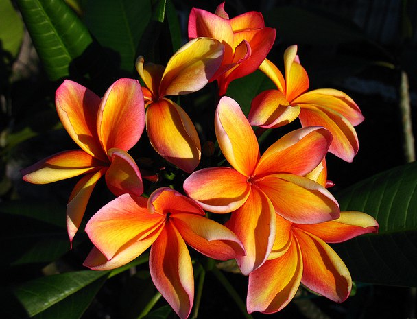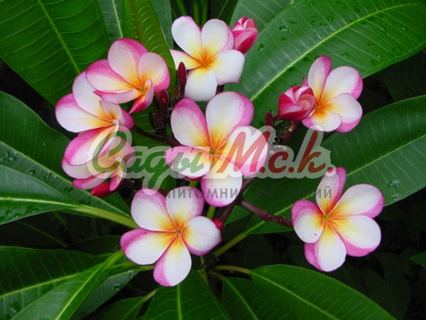Plumeria Makaha Sunn - цветущий декоративный кустарник. Листья очень крупные, тонкие, длинные, темно-зеленые, гладкие, жилкованные. Цветки средних размеров, диаметром 9 см, состоят из 5 лепестков. Лепестки продолговатые, эллиптические, темно-желтые с розово-красными оттенками и прожилками.