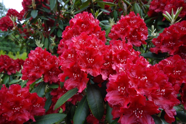 Рододендрон Torero - сильнорослый широкий кустарник с прямым силуэтом. После 10-ти лет достигает 150 см. Цветы чистого красного цвета с тёмно-красным пятнышком. Долгоцветущие даже под прямыми солнечными лучами.
