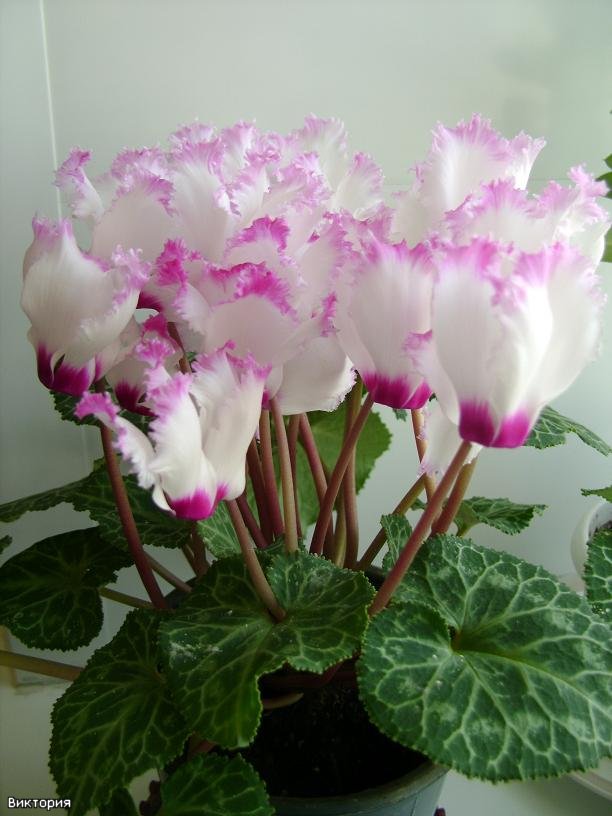 Цикламен персидский Виктория - Многолетнее клубневое растение семейства Первоцветные. Цветки белые с ярко-лиловым бахромчатым краем и глазком, очень ароматные, цветонос достигает длины 15 -20 см. Цветет с поздней осени до конца апреля, летом находится в состоянии покоя. Оптимальный срок посева конец августа. Семена перед посевом замачивают на сутки в теплой воде, а затем высевают в горшки с листовой и торфяной землей(1:1).Сверху семена присыпают слоем земли 0,5-1см, обильно поливают, накрывают темной пленкой. При t 20 °C всходы появляются через 30-40 дней. После появления всходов притенение снимают, температуру снижают до 15-17 °C. Когда образуются маленькие клубеньки с двумя листочками, пикируют в ящики со смесью из листовой, торфяной земли и песка (2:1:0,5). При пересадках у молодых растений верх клубенька должен находиться у самой поверхности почвы (не глубже 0,5 см). У взрослых растений верх клубня обычно открыт. В период покоя сбрасывает листья. Выращивают на северных и восточных окнах, на южном притеняют от прямых солнечных лучей. Зимой содержат на светлом месте при температуре не выше 8 - 10 градусов. Летом необходимо выполнять приемы по поддержке роста растений: поливать исключительно через поддон, опрыскивать водой комнатной температуры, удобрять. Удобряют не более 2-3 раз за лето, преимущественно азотно-калийными удобрениями.