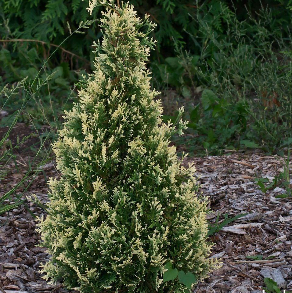 Туя западная Variegata - небольшое хвойное деревце с узкой конусовидной симметричной кроной до 3м высотой. Хвоя чешуйчатая зеленая с светло-кремовыми вкраплениями. Растет медленно. Эта туя неприхотлива в уходе. Отлично приспосабливается к различным климатическим условиям. Может расти практически на любой почве, даже той, которая не отличается плодородием и влажностью. Отлично переносит городские условия. Лучше растет на солнце. Применяется в одиночных, групповых посадках, для создания живых изгородей, для выращивания в контейнерах.