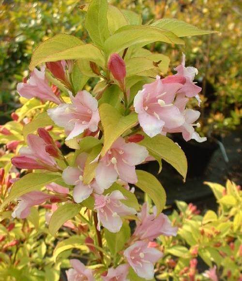 Вейгела гибридная Looymansii Aurea – кустарник высотой до 1 метра с шириной чуть более метра. Листья тоже небольшие, до 5 см в длину, бледно-желтого цвета. Ближе к концу лета они зеленеют. Особенность – цветет дважды. Сначала в мае, розовыми цветками по 3-4 штуки в соцветии. Затем в августе, но менее обильно. Чтобы второе цветение было пышным, можно в июне подкормить вейгелу азотистым удобрением. Другая особенность сорта – любовь к полутени; в отличие от своих «собратьев», не слишком любит солнце и обгорает на нем. Поэтому лучше высаживать ее в тенистых местах: возможно, под пышной кроной дерева. От северного ветра вейгелу нужно защищать, а прикорневой слой нужно мульчировать опилками. Есть и третья особенность – не любит сильный полив. На зиму нужно укрывать. Применяется в декоративных целях – вдоль бордюров, у дома, в клумбах и ландшафтных композициях.