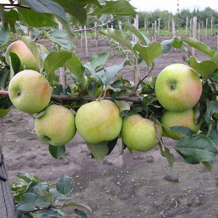 Саженцы колоновидной яблони Тилеймон принадлежат к зимостойким сортам. Дерево средней величины, с компактной кроной, темно-зеленой листвой. Плод крупный, массой до 190 г, округлой формы, основной цвет – зеленоватый с небольшим румянцем. Мякоть сочная, желтого окраса, кисло-сладкая, ароматная, структура мелкозернистая.