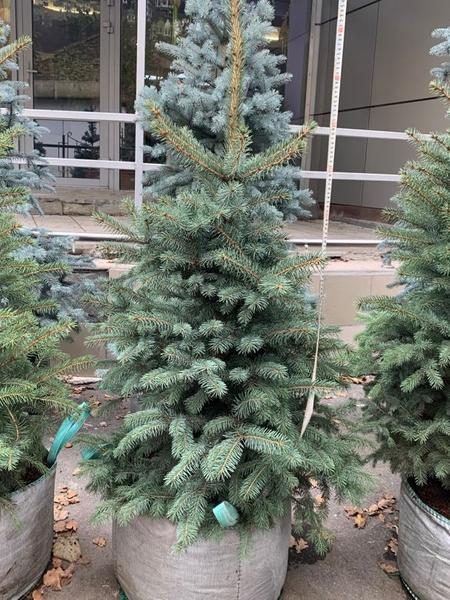 Колючая ель Глаука (‘Glauca’) - Это дерево отличается большими размерами, крона его густая, имеет форму широкого конуса с диаметром до 6–8 м и острой верхушкой. Каждый год растение прибавляет по 30 см в высоту и 15 см в ширину. Во взрослом возрасте высота этого сорта голубой ели может достигать 25 м, а диаметр ствола — 1,2 м. В природных условиях дерево живет до 400 лет. Хвоя Глауки жесткая, колючая, голубовато-стального цвета, длина иголок достигает 2–3 см. С возрастом окраска этого сорта ели становится более яркой, серебристо-голубой. Колючие ветви расположены горизонтально, их украшают цилиндрические шишки, которые бывают разных цветовых оттенков в диапазоне от светло-зелёного до коричнево-бурого. В длину шишки достигают 6–15 см. Этот сорт голубой ели хорошо переносит морозы и непритязателен к почве. Он не боится загазованности, пыли, копоти и легко приживается в условиях города. Глауку используют для создания ландшафтных композиций, формирования аллей и украшения городских построек и частных подворий. Голубая ель легко переносит разнообразные изменения формы при помощи стрижки, из группы посаженных в ряд особей можно создавать живые изгороди. Сорт с ботаническим названием ‘Glauca’ широко применяется в декоративных целях. Именно это дерево чаще всего используют в качестве новогодней елки.